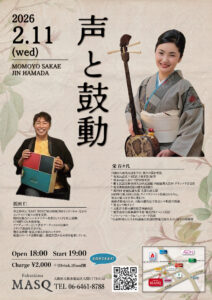 声と鼓動 OPEN 18:00 START 19:00 MC ¥2,000(1Drink1Food別) 出演:栄百々代/浜田仁