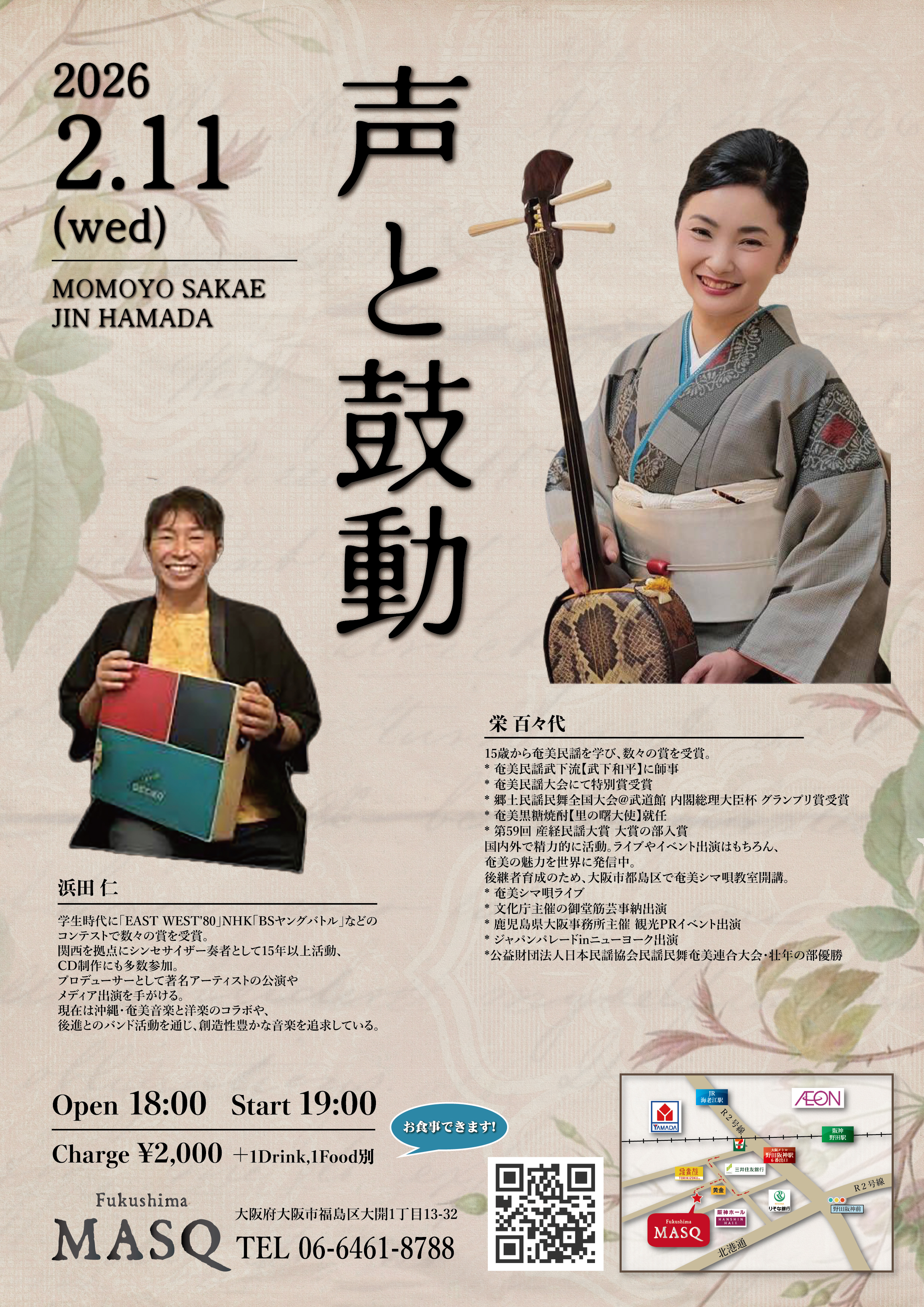声と鼓動 OPEN 18:00 START 19:00 MC ¥2,000(1Drink1Food別) 出演:栄百々代/浜田仁